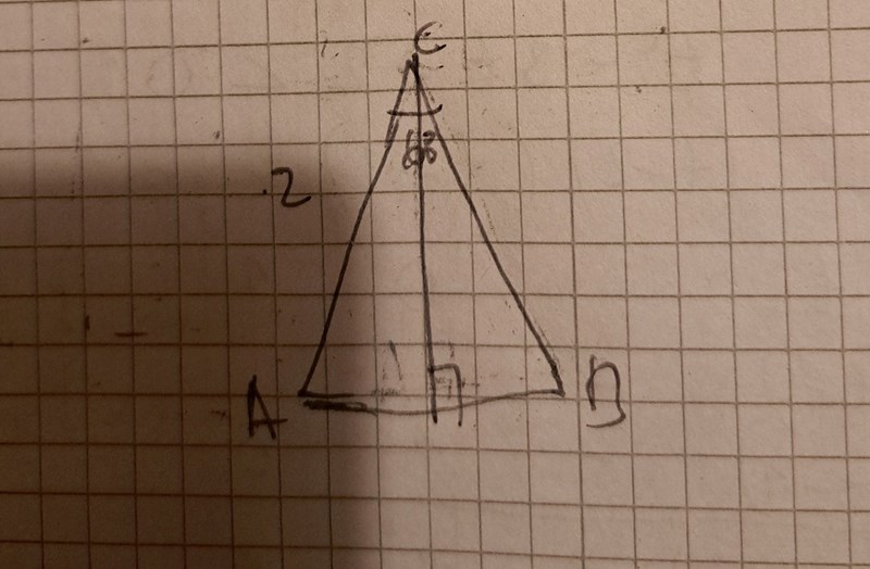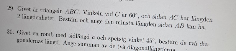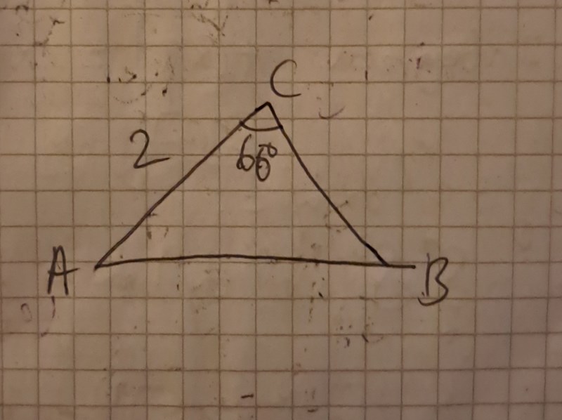Jag förstår ej logiken i denna uppgift. När jag ritar triangeln ABC som en rätvinklig triangel så får jag att AB=2sqrt(3) och den motstående vinkel enligt min figur är typ 60 grader. Borde det ej vara så att en kortare sida har en mindre vinkel medan en längre sida har en större vinkel? En annan sak är att när jag ritade ABC triangel som ej är rätvinklig till höger i min bild så var det svårt att lösa sidan AB mha cosinussatsen och sinussatsen. Är min andra metod enda sättet att lösa uppgiften på? Kommer ej på andra sätt i nuläget.