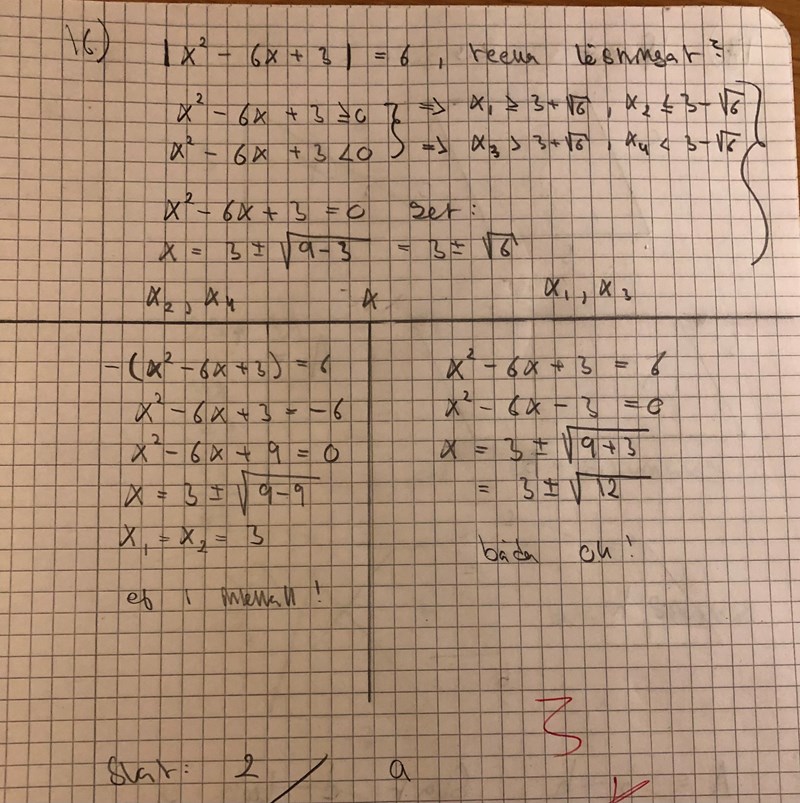 Det var kanske lite väl många falluppdelningar (för en så pass "enkel" uppgift i någon mening). Du kunde ha kvadratkompletterat direkt och insett hur många lösningar som finns, men jag tror att det kan vara nyttigt att tänka på alla olika fall separat ändå. Absolutbeloppfunktionen är något som kan vara lite klurigt när man inte stött på den så ofta, och det lönar sig nästan alltid att rita en bild när den kommer in i bilden.