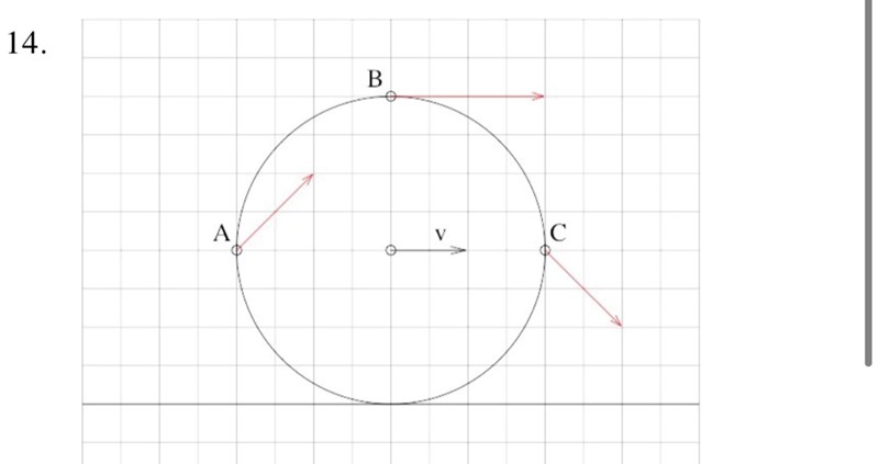 Den första relativa hastigheten i ovanstående formel är riktad och storlek som v i bilden. Den andra relativa hastigheten i formeln har också storleken v, men riktad i hjulets tangentens riktning. Lägg ihop dessa två och du får resultatet i nedre bilden.