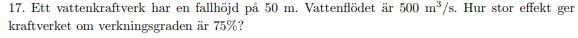 Jag tänkte att W=mgh=500×ρv×g×50,  Etillförd=0,75W och P=0,75Wt där t=50×2g3 vilket ger fel svar.