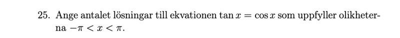 Sätter du in pi i den givna ekv får du VL=0 och HL=1, alltså är pi inte någon lösning till ekv. Du menar kanske att antalet lösningar är 0? Det kan du kolla grafiskt genom att rita upp kurvorna och se om de skär varandra någonstans i intervallet -pi<x<pi (eller om du föredrar -180°<x<180°). Varning: utnyttja inte graferna som lösning. De är bara för dig själv, för att veta hur det ligger till. Ekvationen ska du hantera algebraiskt och trigonometriskt.
