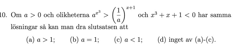 Efter lite förenkling fick jag x^3+x^2+1>0 . Men när jag såg alternativen så känns ej c) rätt då den ger utrymme för att a=0 då villkoret säger a>0. Så jag körde på d) vilket såklart ej är rätt svar. Hur skall man ha tänkt här?