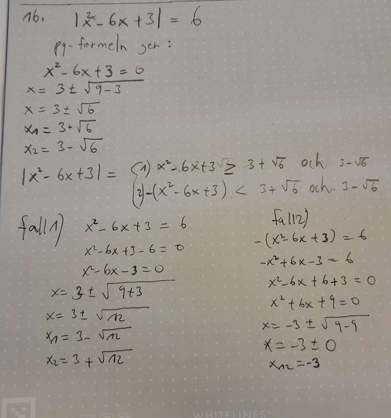 Fick 3 st lösningar. x3=3 fungerar. Men de andra är jag osäker över hur mycket de är utan räknare. Uppskattade roten ur 12 till 3,4 vilket ger mig ungefär 6,4 och -0,4 för x1 och x2. Dock blir det knas när jag stoppar in dem båda i ursprungliga ekvationen.