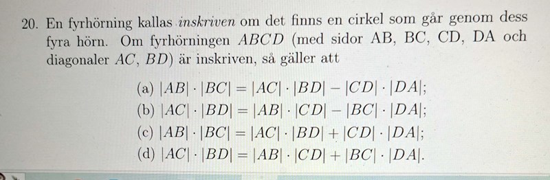Jag får att ena fallet med kvadrat stämmer a) och d) men i andra fallet med rektangel stämmer bara b). Min tredje fall blev en parallellogram där ingen av alternativen funkar. Hur ska man hitta rätta svaret? Vilka fler fall behöver jag titta på?