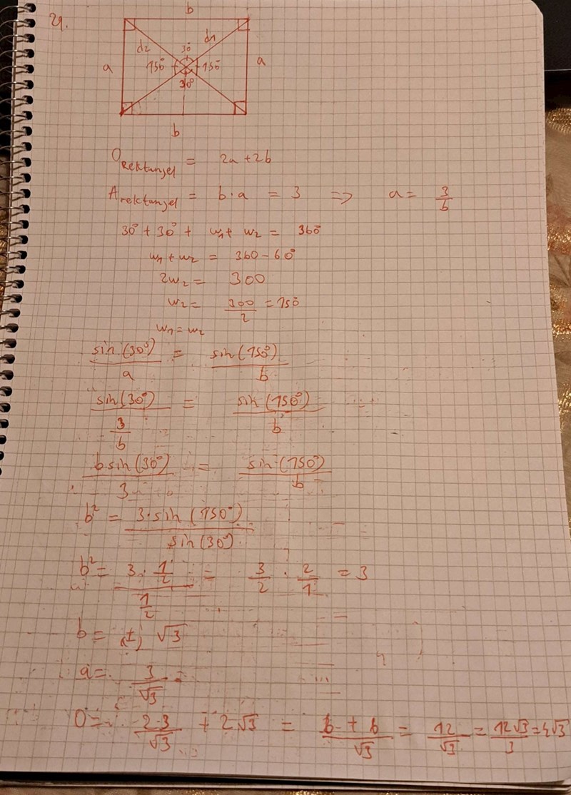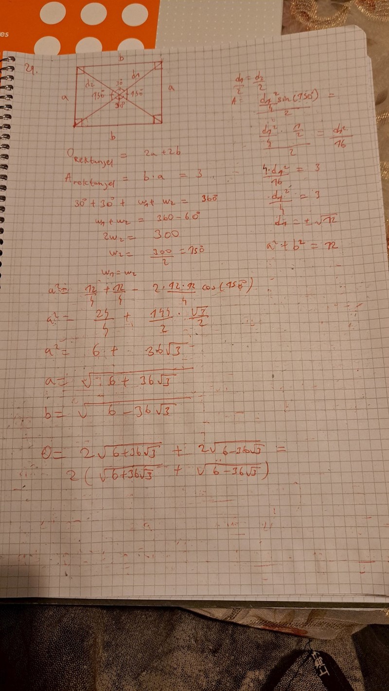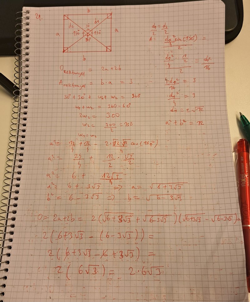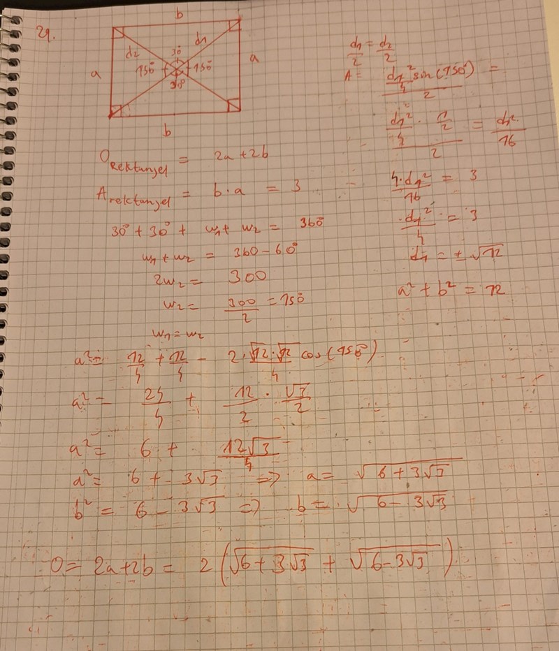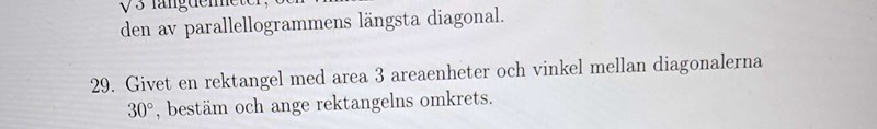 Jag vet att det finns en annan tråd om denna men jag tänkte skapa en egen så jag kommer vidare och förstår vad som gick snett med min lösningsgång här. Som ni ser använde jag sinussatsen men det verkar ej ta mig närmare lösningen än vad jag tänkt. Funderade lite på pythagoras men diagonalerna är ju okända.