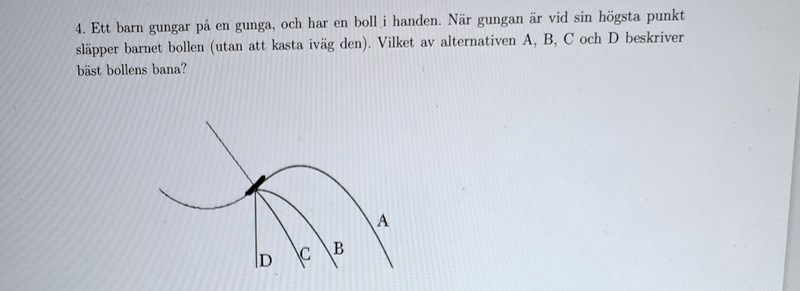 Varför är ej A rätt svar? Det blir som en kastparabel tänkte jag. Men facit kanske tänker på att bollen påverkas av mg nedåt även om gungan är på högsta punkten.