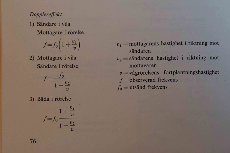 ThomasN skrev:Den formeln du har gäller för en sändare i vila och en mottagare i rörelse (i förhållande till utbredningsmediet, luften).