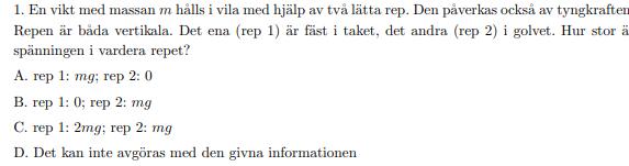Jag undrar också om repen skulle vara vertikala i verkligheten. Förstår inte hur en enpoängsuppgift kan vara såhär förvirrande. Krävs det inte att man själv tillför en kraft uppåt för att det ska finnas en spänning i det nedre repet? Eller handlar det om att det inte är mg som blir spänningen i det övre repet?