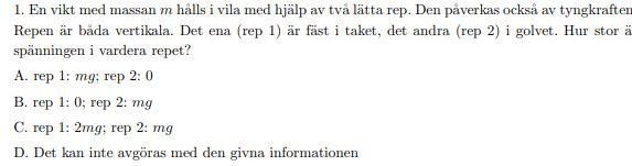 Hur ska man tänka här? Tänker spontant att svaret är A, då eftersom vikten dras ner med kraften F = mg måste det finnas en kraft som är lika med mg i motsatta hållet.