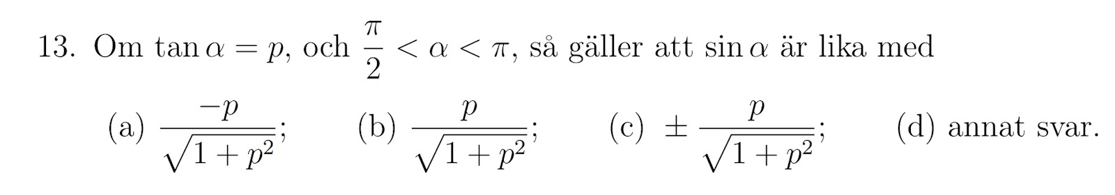 Hassan1 skrev:Jan Ragnar skrev:Det du har skrivit är en identitet. Meningen är att sin(α) skałl uttryckas med p-termer. Då vinkeln alfa ligger i andra kvadranten är p ett negativt tal. Alltså (b).