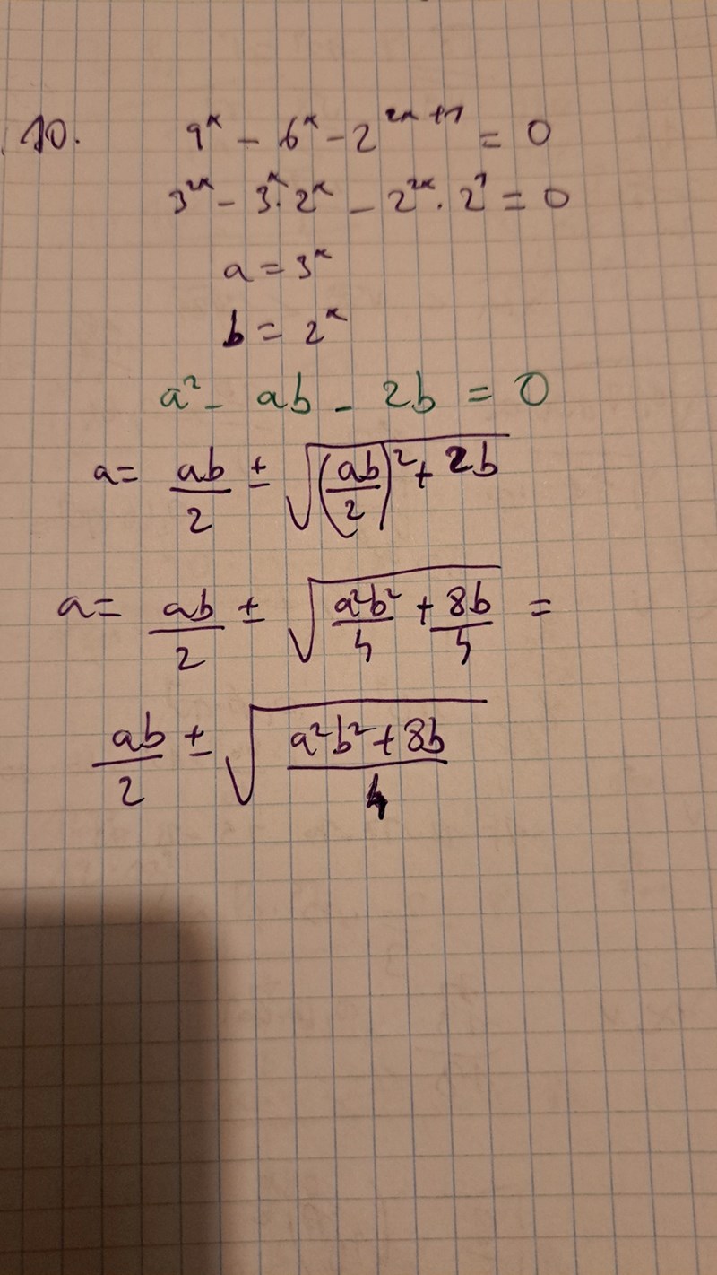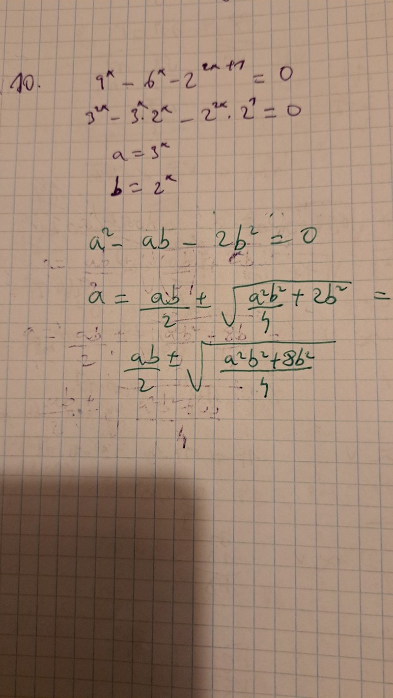Jag vet ej riktigt hur man löser 10an. Försökte skriva om som 3^2x-3^x*2^x-2^(2x+1)=0. Men fastnade och testade istället att sätta in heltal på x från 0 till 2. Då fick jag att likheterna dvs HL=VL ej stämmer. Då valde jag a) som svar,men b) är rätt svar.. Hur bör man gå vidare här?