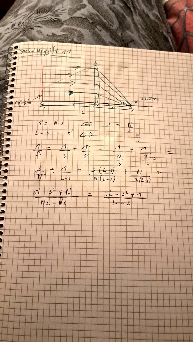 Vill du förklara vad den här meningen innebär från uppgiftlydelsen. "Och skärmen erhålles på skärmen en skarp bild som är N gånger så stor som föremålet"? Allt jag har förstått hittils är att vi har en lins i mitten och skärm på höger sida och ett föremål på vänster sida. Avståndet mellan skärmen och föremål är L. Det framgår ej vad avståndet från föremålet till linsen är eller linsen till skärmen.
