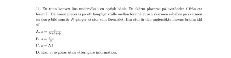 Använd linsformeln på den här situationen och se sen om du kan få något av svarsalternativen att passa!