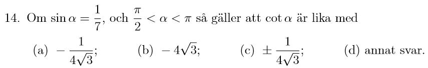 Först använder jag mig av trigonometriska ettan för att räkna ut cosinus alfa