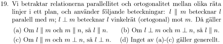 (c) om l och m är parallella och m och n är vinkelräta mot varandra så kan man dra slutsatsen att l och är vinkelräta