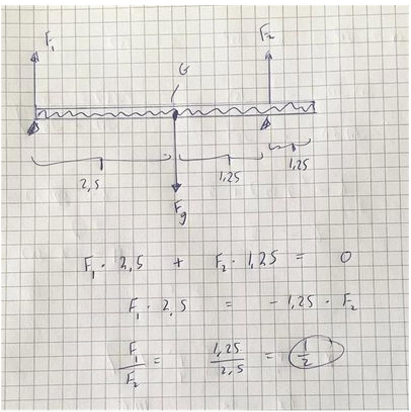 Om du nu väljer att medurs är positiv riktning så blir din jämviktsekvation F1•2,5 - F2•1,25 = 0, vilket ger dig 2,5•F1 = 1,25•F2 o.s.v.