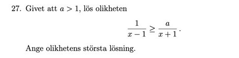 Facit säger : vilket jag får för största värde för täljaren. Men om nämnaren blir negativ, ex x=0.5 , då blir hela ekvationen mindre än noll om täljaren är större än noll. Försökte göra teckentabell men var svårt då jag endast vet att a>1 . Hur ska man tänka? Ska man ignorera nämnaren, isåfall varför?