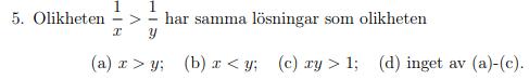 Jag svarade d) eftersom de övriga alternativen är definierade för x,y = 0, alltså svar: x<y, x,y =/= 0. Är det rätt tänkt?
