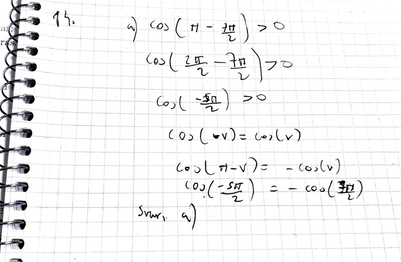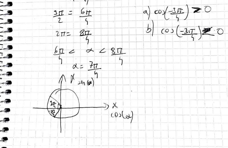 Okej smart! Då ser vi att a) cos(-3pi/4)>0 och b) cos(-3pi/4) <0
