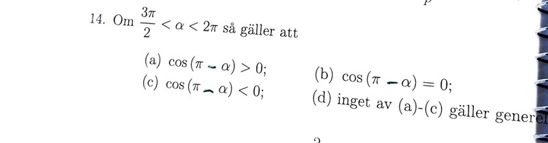 Ja precis det stämmer. Så hela uppgiften handlade om att bestämma vilket tecken cos(pi-alfa) har under förutsättningen att alfa ligger i det givna intervallet i uppgiften?