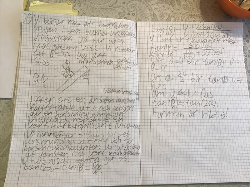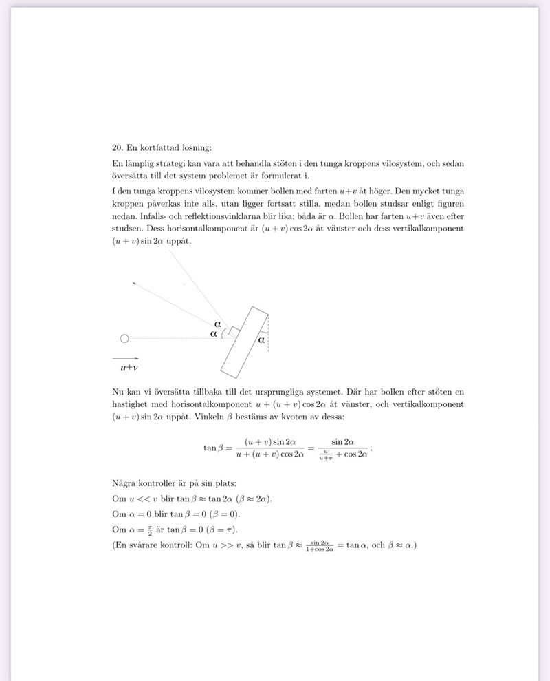 Hejsan, jag har tittat igenom facit till den här uppgiften och förstår den övervägande majoriteten av lösningen, men det är en del som jag inte riktigt förstår. Varför ska horisontalkomposanten bli u+(u+v)cos(2a) efter stöten medan vertikalkomposanten blir (u+v)sin(2a)? Varför ska u adderas, borde det inte bara bli (u+v)cos(2a)? Tack på förhand.