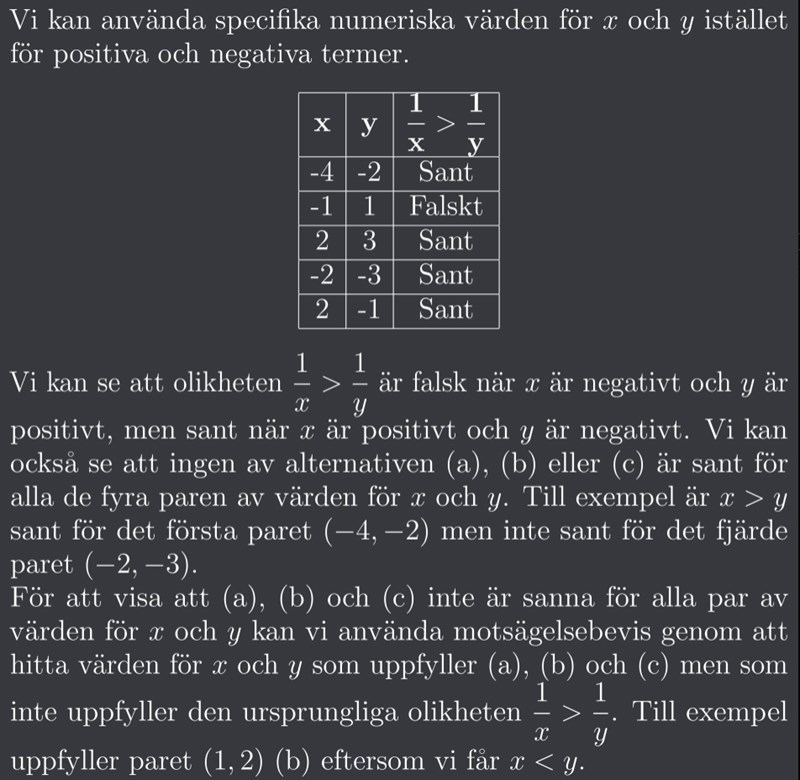 a) x>y har en lösning x=4 och y =2 denna lösning är inte en lösning till olikheten ().