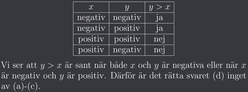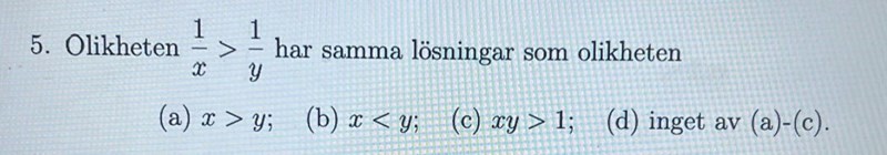 Vid första anblick så kände jag att (b) var rätt svar, men jag begick ett misstag då det inte sägs ifall x eller y båda är positiva, eller om endast den ena är positiv, eller om båda är negativa, osv.