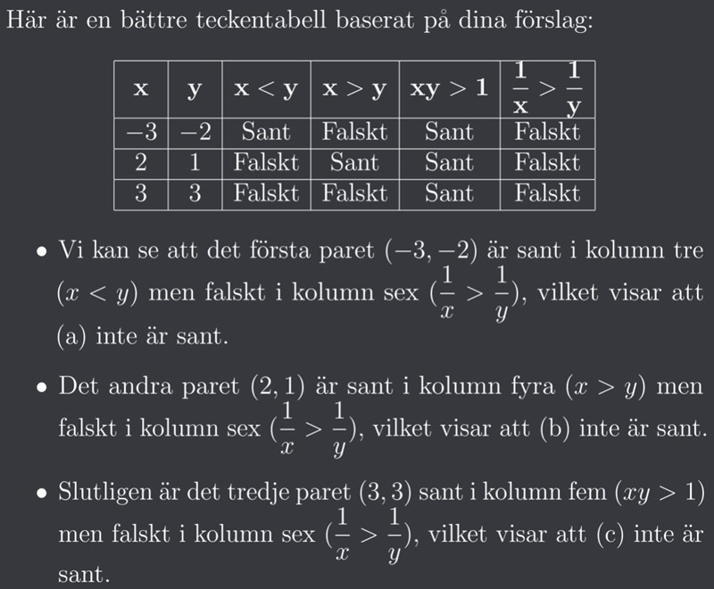Tabellen du gjorde är ganska bra för att du ska förstå hur olikheten fungerar i olika värden av x och y. Men jag tycker att du behöver koppla tabellen till uppgiften genom att lägga till tre kolumner efter de två första du hade,så kolumn tre ska vara (x<y), och kolumn fyra (x>y) och kolumn fem (xy>1) och sen kolumn sex ().