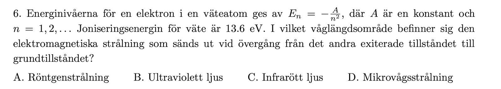 Att jag kunde utesluta C och D är för att jag vet att i väteatomens Balmerserie där vi har övergångar från något n>2 ner till n=2 så finns synligt ljus. Går vi från n=3 ner till n=1 så får vi större energiskillnade och bör alltså få kortare våglängder. C och D (infrarött och mikrovågor) är båda längre våglängder än synligt ljus.