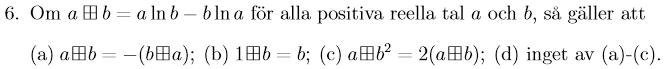 a) -(b+a)=-(blna-alnb)=alnb-blna=a+bb) 1+b=1lnb-bln1=1ln(b)=lnb bc) 2(a+b)=2(alnb-blna)=2alnb-2blna=lnb2a-lna2b=lnb2aa2ba+b2=alnb2-b2lna=lnb2a-lnab2=lnb2aab2a2bab2, därav gäller inte c)