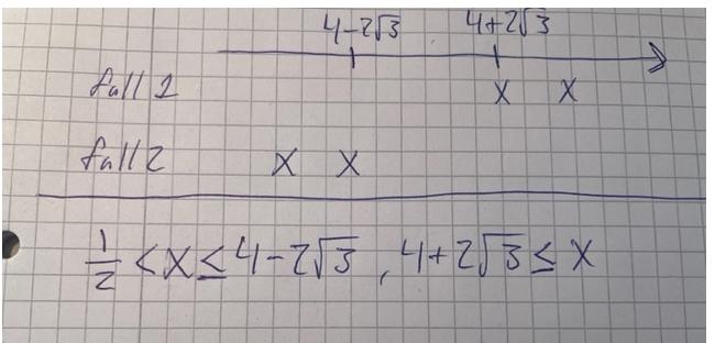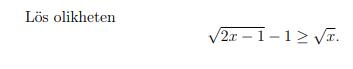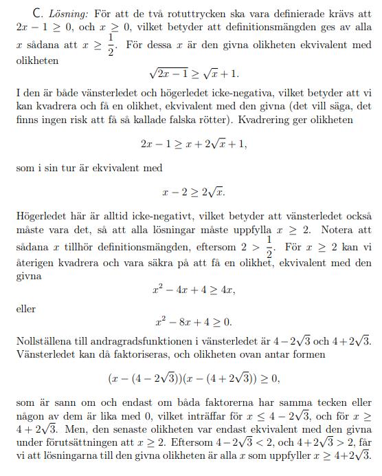 Jag har nog förvirrat mig själv lite. Jag förmodar att vi ser i grunduttrycket att x>=1/2 men vi vet inte i det läget om det skulle stämma för värden lika med eller över 1/2. Men när vi kvadrerar ser vi att x inte kan vara mindre än två vilket då också gäller för grunduttrycket.
