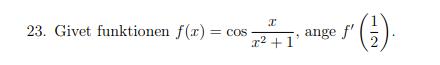 Nuså nu funkar det, förståd inte hur man skulle räkna ut f'(g(x)) till en början men kom fram till att f'(g(x)) betydde med andra ord -sin(x/(x^2+1)) där -sin=f' och g(x)=x/(x^2+1). Tack för hjälpen!