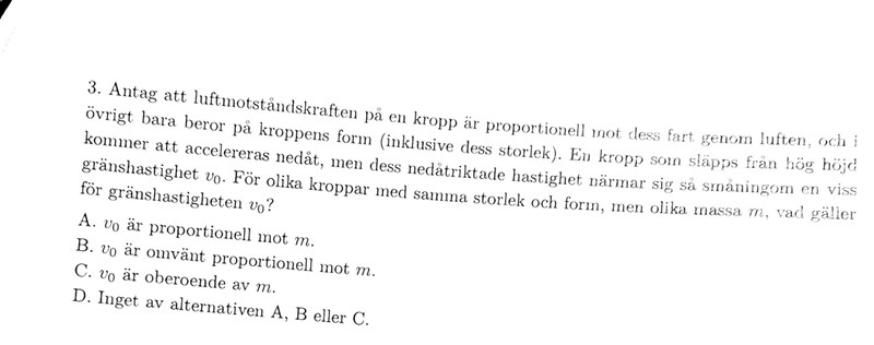 Jag valde C men det är tyvärr felaktig svar. Hur ska man ha tänkt? Hastighet är väl ej beroende av massa om det är luftmotståndskraften?
