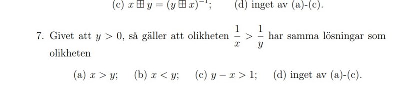 Det enda jag förstår är 1/x>1/y vilket stämmer med alternativ a) och 1/y <1/x stämmer om alternativ vore typ y <x men sån alternativ har vi ej