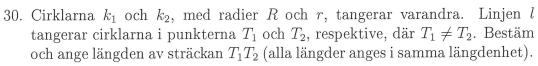 T1T2 räknade jag som hypotenusan i en triangel med kateterna och R + r vilket ger T1T2=medan rätt svar är 2l.e.