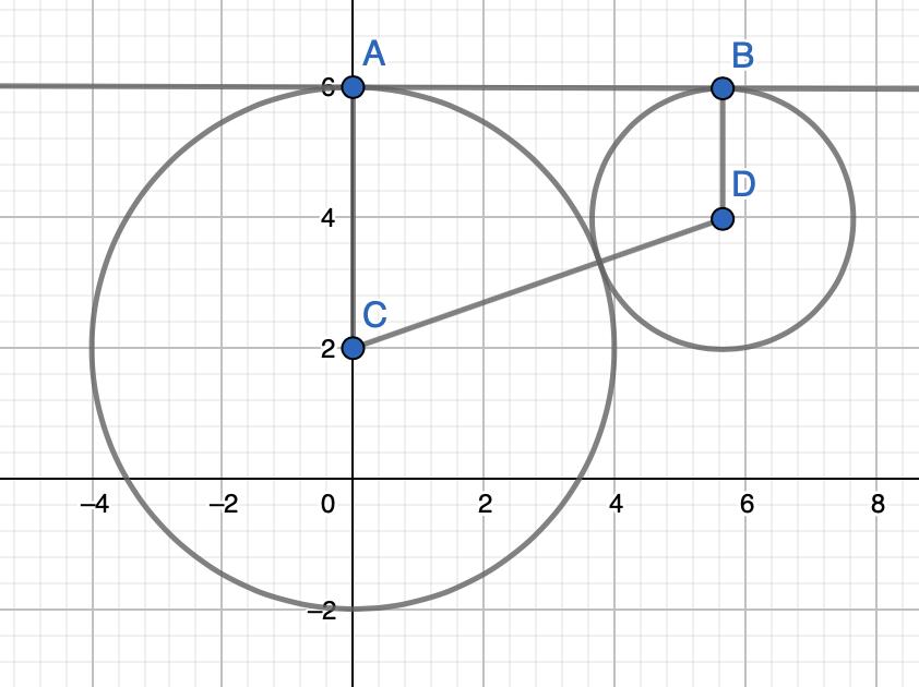 Sträckan AC (motsvarande den större cirkelns radie, R) är vinkelrät mot linjen l, och detsamma gäller för den mindre cirkelns radie. :)