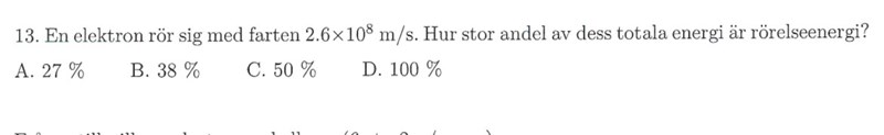 Jag använder mig av E=ymc^2-mc^2 (y är gammafaktorn) och sedan dividerar jag rörelseenergin med denna totala energi. Genom snabb huvudräkning och avrundningar hamnar jag i 58/81 vilket inte är särskilt nära något av svarsalternativen - dock närmst rätt svar C. Har jag gjort fel i formelanvändningen?