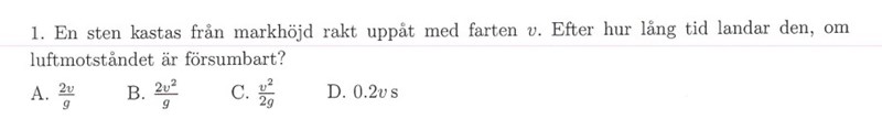 "En sten kastas från markhöjd rakt uppåt med farten v. Efter hur lång tid landar den, om luftmotståndet är försumbart?"