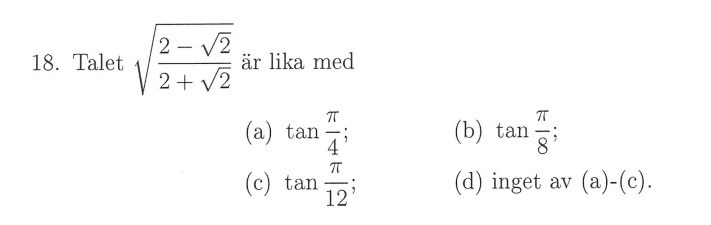 Jag har försökt lösa det genom att försöka förenkla uttrycket och att använda diverse identiteter för tangens, men jag har inte lyckats hitta någon passande form att använda. Jag undrar därför om det är snabbast att förenkla uttrycket eller om det är lättare att räkna ut vad tangensvärdet blir när man tar de olika argumenten.