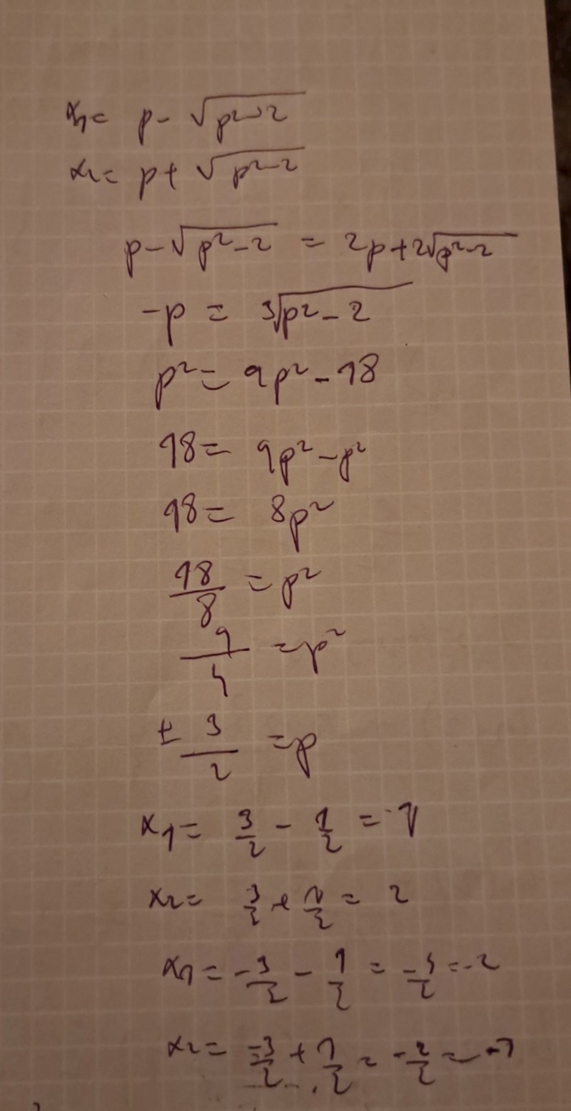 Du har rätt, bara p=-3/2 är en lösning, men x1 och x2 skulle stämma (x1 = -2, x2 = -1)