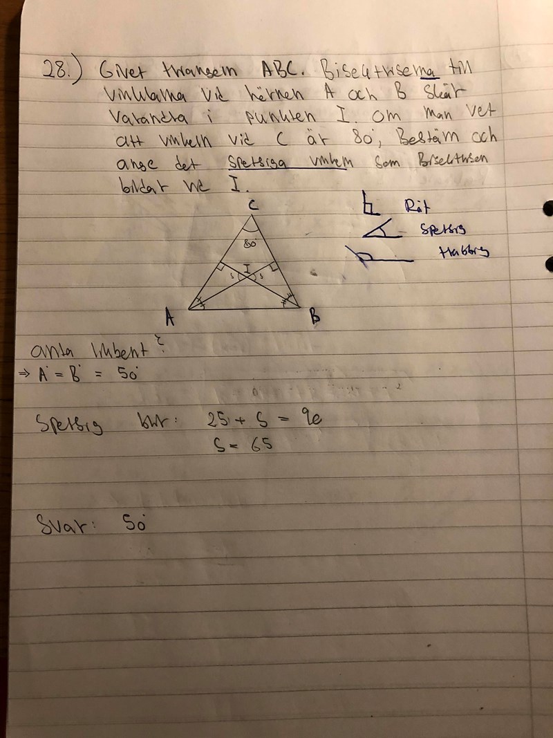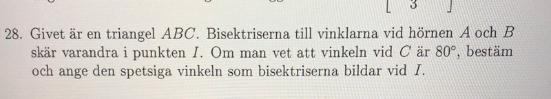 Du skall inte anta att triangeln är likbent, du skall få fram ett uttryck som stämmer för alla vinklar i hörnen A och B. Om vinkeln vid A är 2a, hur stor är då vinkeln vid B? Du vet ju att vinkeln vid C är 80o och att vinkelsumman i en triangel är 180o.