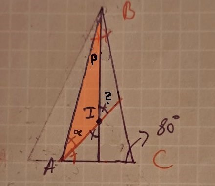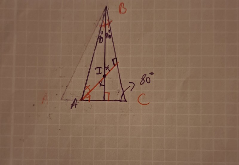 Jag tittade på halva triangeln där vid hörnet B och sedan 80 grader samt rät vinkel bildas det när bisektrisen delar på 2 lika stora delar på sidan AC. Ojdå hur vet man att den ej är likbent?för det känns ju som det när de nämner bisektriserna