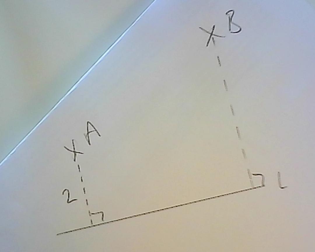 Avstånd mellan en punkt och en linje är det kortaste avståndet, och det är alltid vinkelrätt mot linjen. I din bild är avståndet från A inte vinkelrätt mot linjen L! Däremot är avståndet från B i din figur nästan vinkelrätt mot linjen L