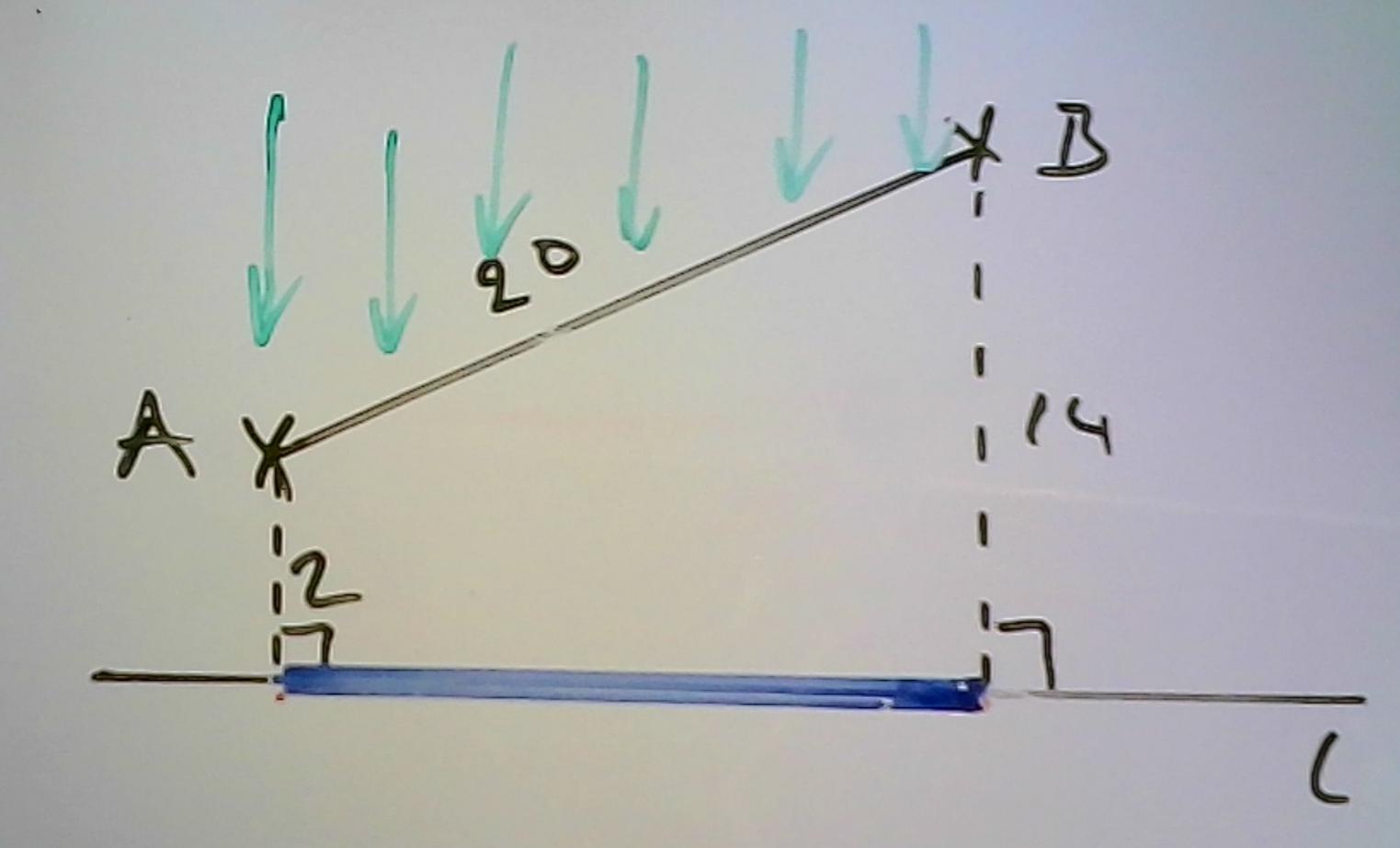 Skuggan är den ortogonala projektionen av sträckan AB på linjen L och det är den som du har beräknat till 16.