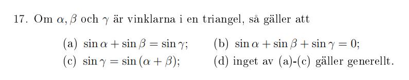 Jag hade ritat en triangel, markerat vinklarna och förhoppningsvis insett att yttervinkelsatsen () tillsammans med ger alternativ c hyfsat fort.