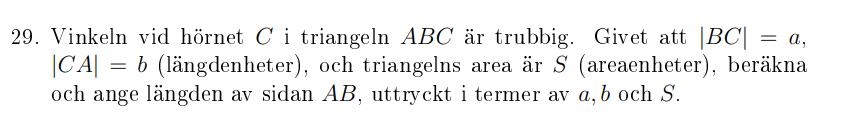 Jag tror jag vet varför. Vinkel C ligger mellan 90 och 180 grader så uttrycket för Cos(v) ska vara negativ Dvs cos(v)=- sqrt((a^2b^2-4S^2) /ab). Jag åkte också på den fällan. Nej facit har rätt.
