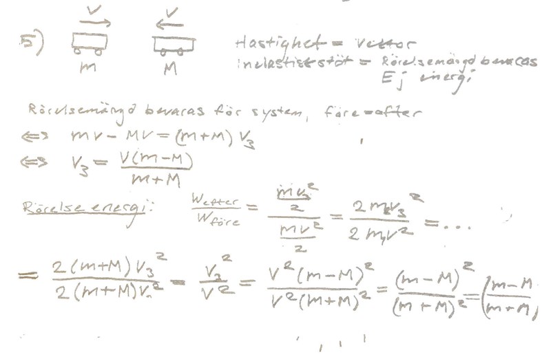 "Två kroppar has massorna m respektive M. De rör sig från början med hastigheterna v riktad i positiv x-led respektive v riktad i negativ x-led. Massorna kolliderar sedan i en helt inelastisk stöt, dvs de bildar efter kollisionen en ny kropp med massan M + m. Kollisionen är "rak", dvs. ingen rotation äger rum efter stöten. Hur stor andel av rörelseenergin går förlorad i stöten?"