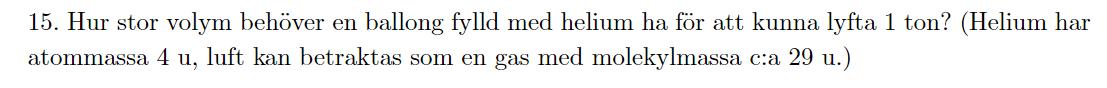 Jag vet att 24 dm3 kan lyfta 25 gram. 1 ton = 1000 kg = 1000 × 1000 gram = 106 gram24 dm3  × 10625= 960 000 dm3 = 960 m3Facit säger att det blir 103 m3.