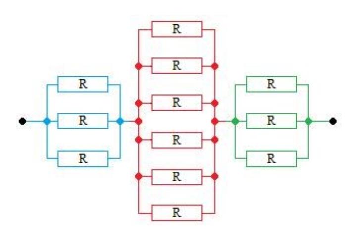 Här ser man tydligt att det är en seriekoppling av tre parallellkopplingar.