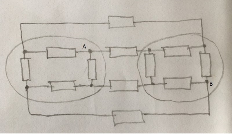 Tricket i såna här uppgifter med lika stora resistor är att man räknar ut potentialen i hörnen och om två punkter har samma potential kan man kortsluta dem, dvs dra en ledning mellan dem. Varför? Eftersom de har samma potential kan ingen ström gå igenom dem och då kan man kortsluta dem. Och då brukar det falla ut.